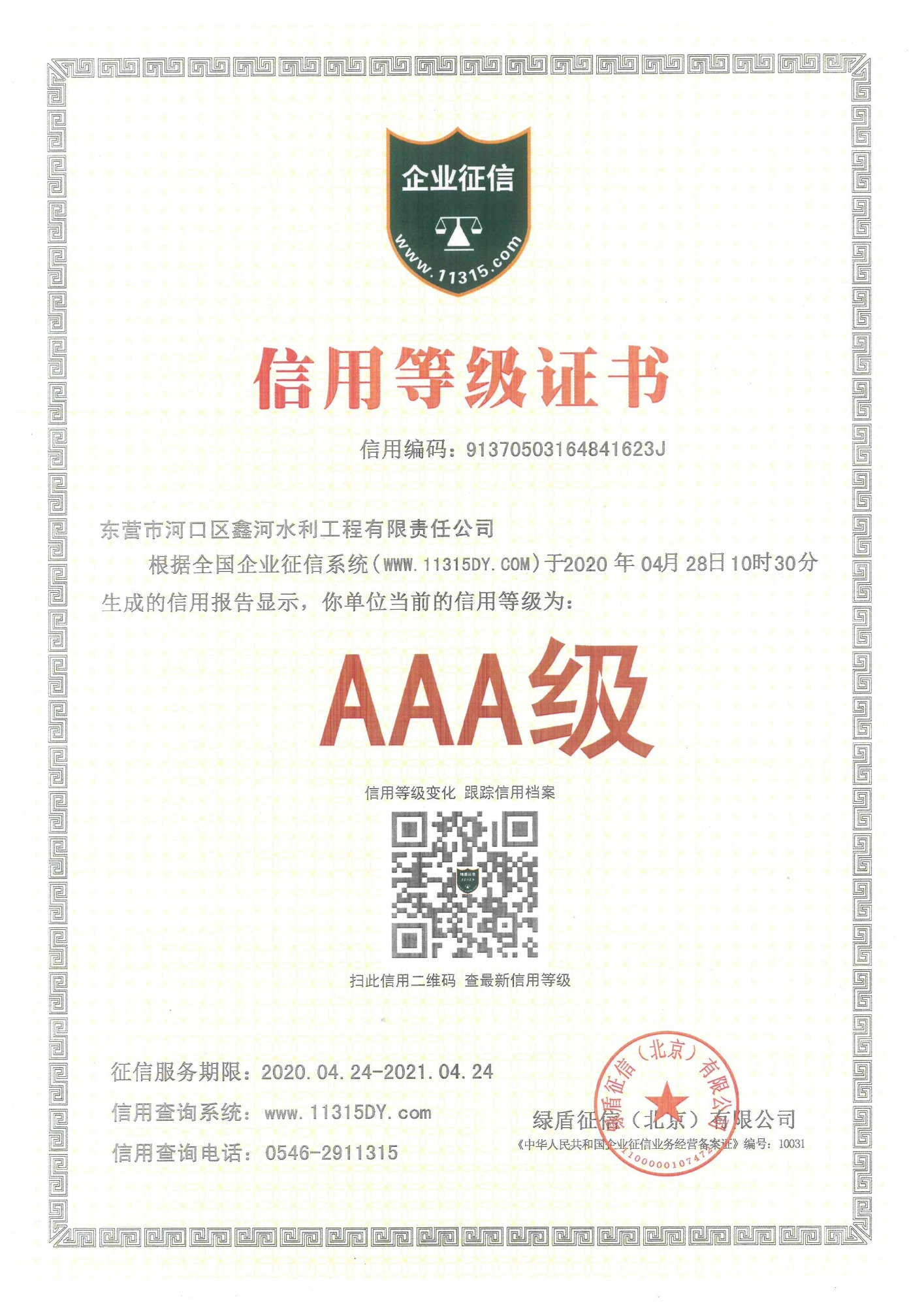 AAA級信用等級證書(綠盾征信)