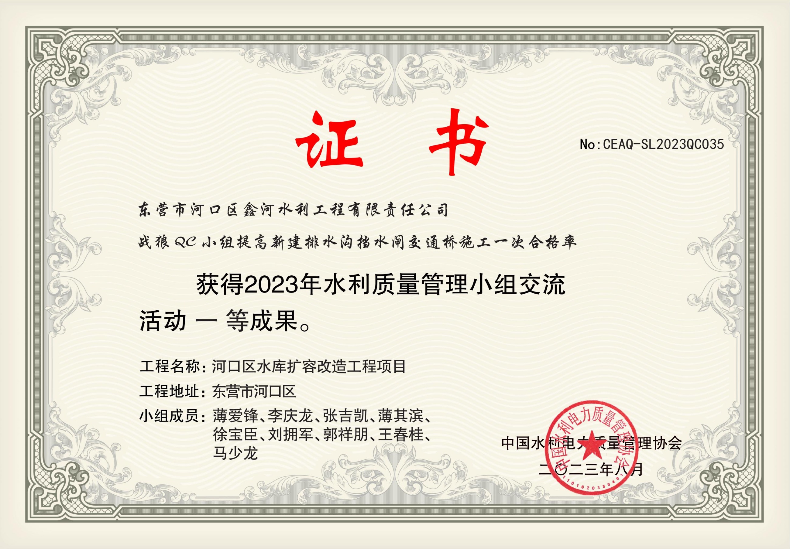 2023年課題:提高新建排水溝擋水閘交通橋施工一次合格率(中國水利電力質(zhì)量管理協(xié)會(huì)一等成果證書)